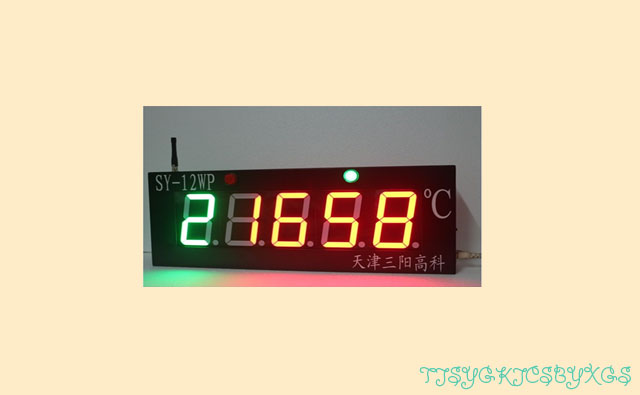 1.无线温度显示屏由电源、接收天线、解码驱动板、2个状态指示灯和5位字高5英寸的超高亮度LED数码管组成,用户的现场操作人员在远处也可清晰读取大屏幕显示看板上各测量点发送的测量温度值。